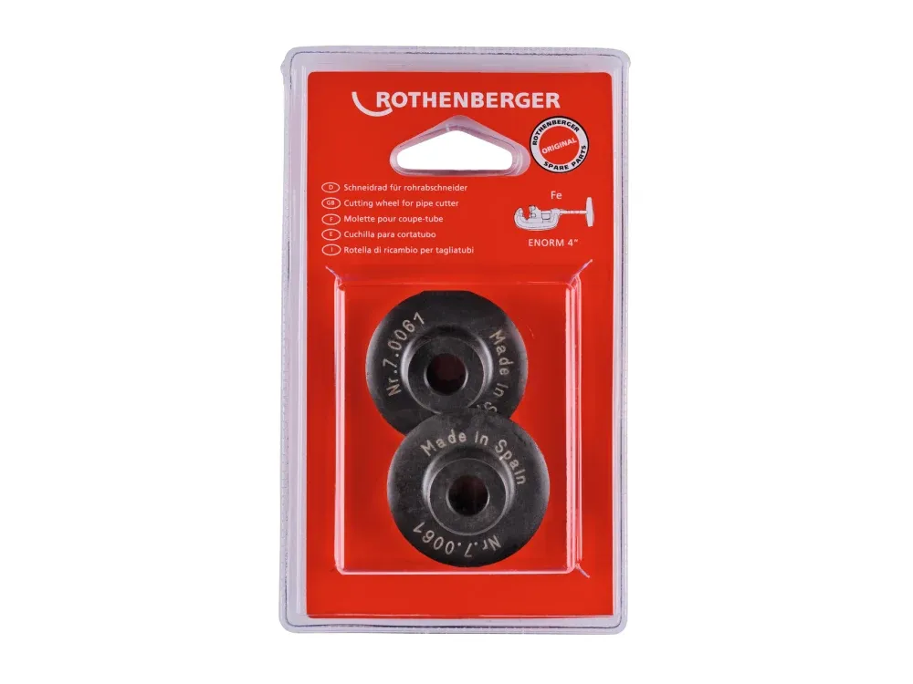 Schneidrad f. ENORM 4" (2 ks) je originální náhradní sada řezných koleček pro robustní řezačku trubek ENORM 4" od značky ROTHENBERGER. Určena pro přesné a čisté dělení měděných, mosazných, hliníkových a tenkostěnných ocelových trubek o průměru 60–115 mm (2–4"). Díky širokým vodicím rolím, kalenému materiálu a snadné regulaci tlaku zajišťuje bezpečný, pravoúhlý a bezotřepový řez — ideální pro přípravu závitů.
