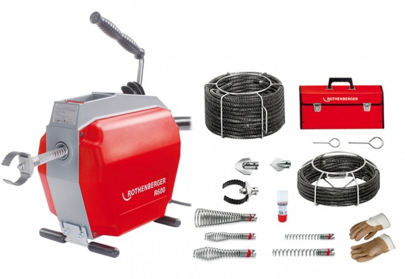 Obsah balení: Čistička potrubí R 600 (230 V), Vodicí hadice, spirálové koše 16 mm a 22 mm, Standardní spirály (5×16 mm, 5×22 mm), Různé typy vrtáků (přímý, kuželový, listový, trychtýřový, křídlový), Rozpojovací klíče (16 mm, 22/32 mm), Ochranné rukavice (levá / pravá), ROWONAL-Sprej na ošetření a konzervování spirál a jejich spojek, ROCASE kufr.
