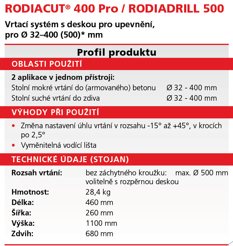 • Technické údaje – Vrtací zařízení RODIACUT 400 / RODIADRILL 500