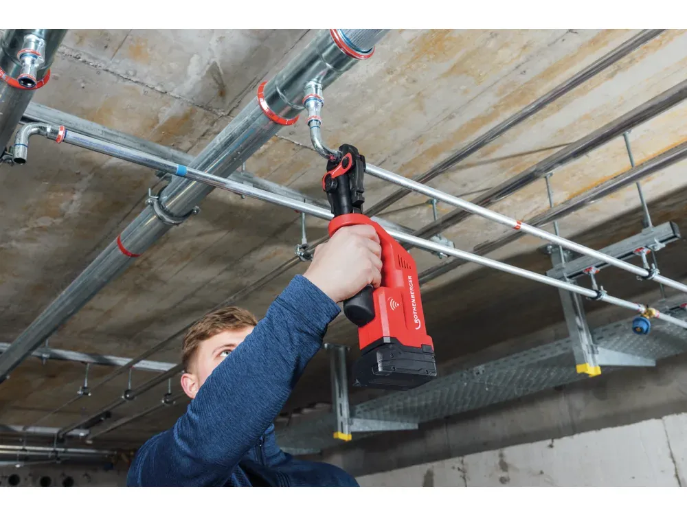 Lisování probíhá rychle — za pouhé 3 sekundy — s konstantní silou 19 kN díky technologii Constant Force Technology (CFT). Pomocí ROTHENBERGER App lze v reálném čase sledovat lisovací data a vytvářet protokoly přímo na místě (funkce CONNECTIVITY).