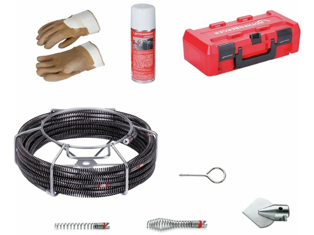 Standardní sada nářadí a spirál s průměrem 16 mm je určena pro profesionální čištění odpadních potrubí v rozsahu 32–75 mm. Vhodná pro použití s kufrovými strojky jako je ROTHENBERGER R550. Díky T-drážkové spojce je zajištěno snadné napojení nástrojů i prodloužení spirál, přičemž šikmá hrana spojky usnadňuje manipulaci. Sada je navržena pro efektivní práci při odstraňování ucpání a údržbě kanalizací.