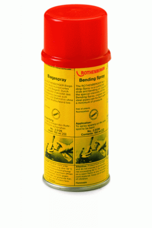 Sprej na ohýbání, 150 ml je speciální sprej určený pro ohýbání trubek z mědi, uhlíkové oceli (C-Stahl) a nerezové oceli. Jedná se o kombinaci kluzného a ohýbacího oleje, která díky své vysoké viskozitě výrazně snižuje potřebnou sílu při ohýbání. Sprej je ideální pro instalatéry v oboru vytápění, sanitární techniky, chlazení a klimatizace.