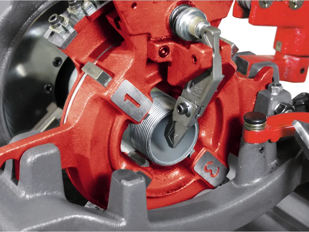 Stroj je vybaven univerzálním systémem uchycení řezné hlavy, robustní olejovou pumpou s regulací průtoku, dvojitě vedeným nástrojovým vozíkem a ložiskovým vedením vřetene. Centrovací a upínací sklíčidlo zajišťuje rychlé zarovnání trubky bez prokluzu. Vnitřní odjehlovač se třemi břity umožňuje tiché a čisté dokončení práce. Plastová nádoba na třísky je snadno čistitelná a přispívá k udržení pořádku na pracovišti.